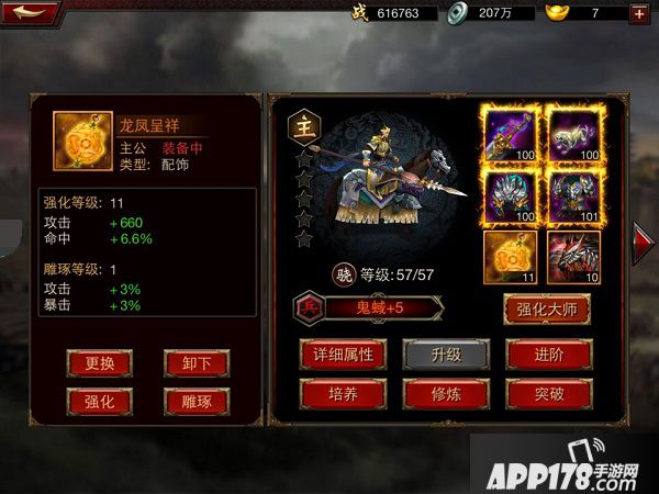 ◆ 每名武将可同时穿戴两件饰品,饰品分为配饰和战马两类。整件饰品在夺宝过程中通过碎片合成获得,在竞技场达到特定排名也可以兑换橙色饰品,饰品的碎片也可以通过商城购买橙色饰品箱子获得。