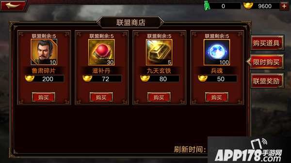 限时购买则是联盟共计少量购买次数,在刷新时间内每个道具每位联盟成员只可购买一次,限时购买出售的道具中还有几率刷新出武将哦,主公们先到先得;