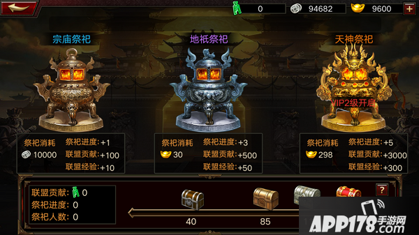 通过联盟祭祀,可以获得联盟经验提升联盟等级,目前的祭祀的方式分为三种:宗庙祭坛、地抵祭坛、天神祭坛,每种祭坛都可以同时获得祭祀进度、联盟经验和联盟贡献。