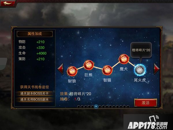 激活天书后,将会获得全体上阵武将的属性加成(属性包括:物防、攻击、生命、策防),还可以获得稀有的道具奖励(橙将碎片等)。随着天书不断研究,能够获得的加成也越来越多,所有属性加成的总和,将在左侧区域显示。天书激活到特定阶段,主公的品质也会提升.蓝,紫,橙,红,一步步变的更强.