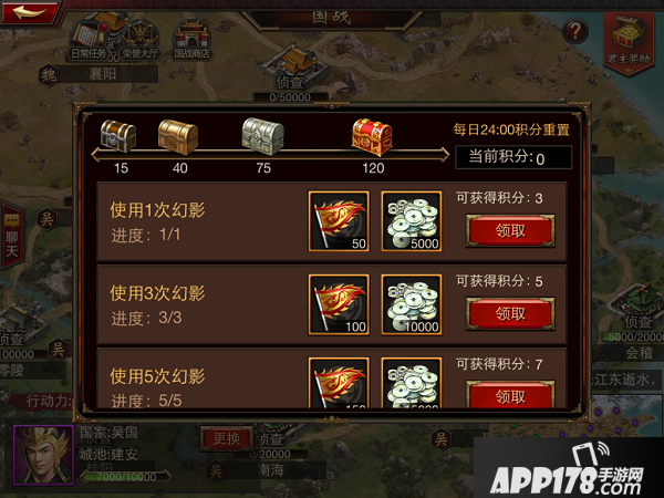 行军打仗,占领地盘,怎么能没有资源呢?国战系统中为大家准备了大量的福利,大家可以点击左上角的日常任务。每天一次重置,只要大家完成了日常任务都会受到奖励,达到一定积分还可以领宝箱。下图是日常任务的界面。