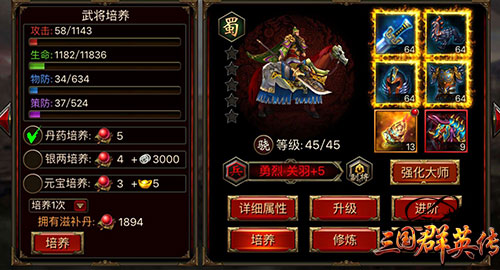 武将培养系统,即为消耗道具概率提升武将属性的系统。在《三国群英传》手游中,玩家可以使用滋补丹、银币、元宝三种不同种类的道具来提升武将的属性。通过培养系统,可以提高武将的攻击、生命。物防、策防四种属性。培养方式分为3种:培养1次、培养5次、培养10次。方便玩家快速培养武将。