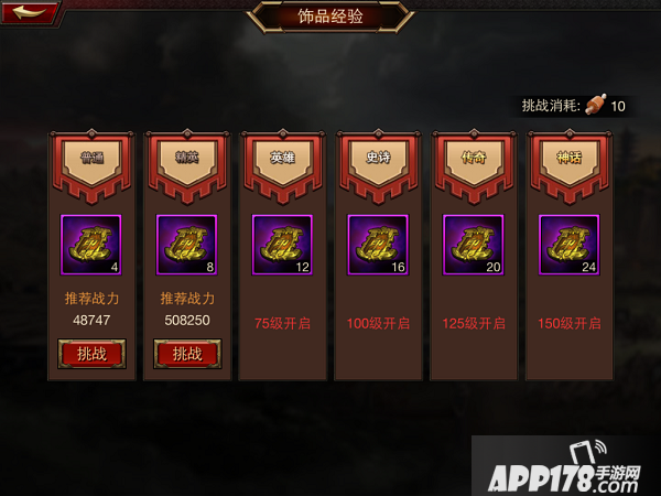 饰品经验副本是日常副本的其中一个。每周的周二,四,六,日开启饰品经验副本,需要消耗10点体力,一天只能挑战一回。根据大家自身的战力水平,可以选择不同难度的副本进行挑战,难度越大,收获得黄金印越多