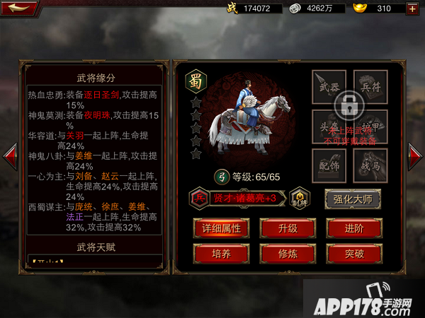 一心为主:与刘备、赵云一起上阵,攻击提高24%,生命提高24%