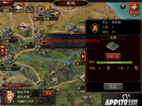 主公志在天下,只会攻占城市,却不会守城可不行,这里向主公们介绍一下国战系统中修筑城防的方法。主公只要点击自己所在的城市,会显示出城市概况(如上图所示),可以消耗行动力或者元宝修筑城防,修筑城防会为主公们带来可观的军功和国家贡献。加紧行动吧。