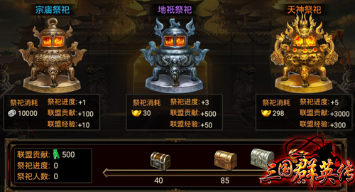 正所谓“一人拾柴火不旺,众人拾柴火焰高”。联盟的成长是联盟成员进行联盟祭祀进行的。玩家需要通过:宗庙祭坛、地抵祭坛、天神祭坛三种祭祀方式使联盟获得经验值,进而提升联盟等级。每种祭坛消耗的道具不同,相应的玩家获得联盟贡献值也不同。