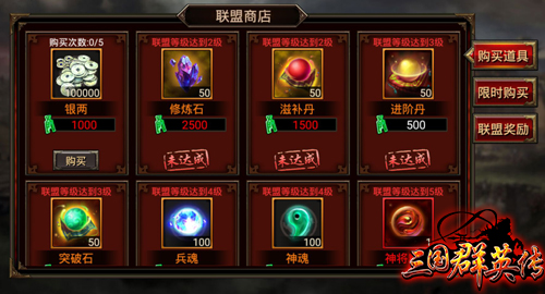 《三国群英传》手游有大量的重要道具需要在联盟商店中获得,比如修炼石。而联盟商店中商品的品质和联盟的等级是挂钩的,联盟等级越高,出现的商品品质就越好。在联盟商店里,联盟贡献值是主要的货币,所以玩家可以使用联盟贡献在商店中购买想要的道具。联盟贡献值则来源于联盟祭祀、联盟副本等联盟玩法。