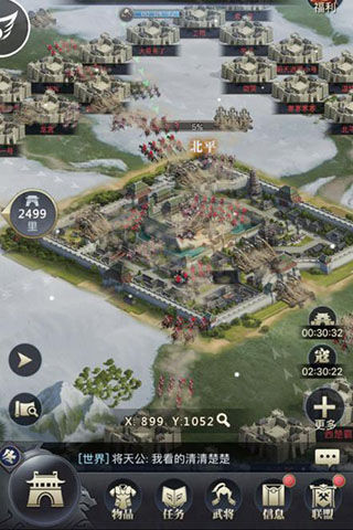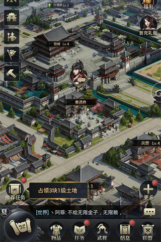 在主城中主公们将通过招兵买马,打造属于自己的军队,演绎一方诸侯的崛起之路,更能通过一系列的主城建设不断生存壮大,开疆拓土,从而实现一统天下的霸王之业。辉煌精美的宫城、诗意闲适的农田、熙熙攘攘的市场、布阵严明的军营、有序运作的工坊……主公们将在循序渐进的内城建设中不断产出所需资源,从而不断发展己方势力,攻城略地。想必如此精致宏大的皇城必将激起主公扩大本国势力版图的欲望,征战四方将由此开启!