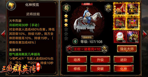 新版本上线后,玩家可以点击武将界面最右下方的“化神”按钮对90级进阶+8的所有红色、橙色武将进行化神,主角不可化神。武将化神后,可大幅度提升武将属性(攻击、生命、物防、法防)、品质、天赋、技能效果。化神系统共分为3阶,每阶又分为5级。橙色武将化神后可提升为红色品质。化神消耗将魂、化神丹、神将精魄、武将碎片、银币等资源道具,玩家可通过化神预览查看化神满级后的属性,橙将可看变为红色后的技能和天赋,红将能看满阶后的技能属性。重生、分解武将时,返还所有化神消耗资源。