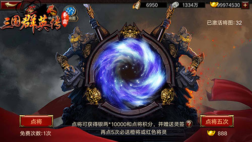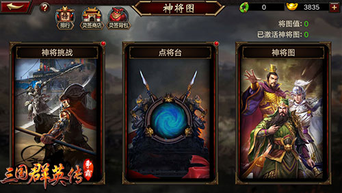 等级达到55级的主公可以在版本更新口开启“神将图”玩法。玩家在本玩法中将会获得武将灵签,使用灵签激活神将图可获得额外属性加成(所有上阵武将)。神将图分多个章节,每章内有多条可激活属性。章节开启条件与主人公等级有关,并且需激活前一章节。等主角等级达到110级后,玩家还可以对每条激活的属性进行升星,升星和激活消耗的灵签类型和数量一致。此外,每条属性激活后可获得将图值,数量等于消耗的灵签数量,将图值达到一定数量后可激活成就,获得额外加成,成就加成也对所有上阵武将有效。