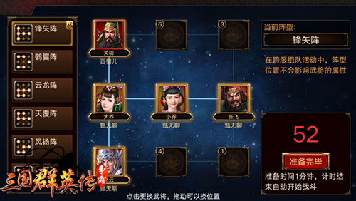 匹配对手成功后,进入布阵界面,由队长负责调配阵容,其他两名玩家等待。系统会按阵型位置的职业需求,默认从共享武将中选择上阵武将,队长可做更改。另外,上阵武将可以重复,例如选择2个关羽,但治疗类型的武将只能上阵1名。队长有60秒时间布置阵容,点击“准备完毕”按钮或者计时结束后,自动进入到战斗初始界面。