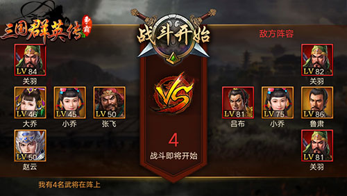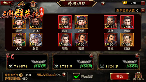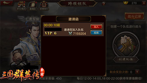 主角等级达到65级后,在“征战”界面会开启“跨服组队战”的选项。战斗由3名玩家组队进行,每位成员可共享自己的4名非主公上阵武将。队友准备后,队长开始进入布阵界面,从12名共享武将中选择5名进行战斗。快来看看自己手下的武将,排出战力最高的4员大将吧!
