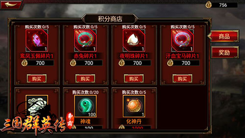 积分商店,里面的商品分为“商品”和“奖励”两类,交换货币为组队战积分。商品页签的物品有每日购买次数限制,每日0点重置购买次数。奖励页签每个商品可购买一次,有的商品荣誉值达到一定条件才允许购买。