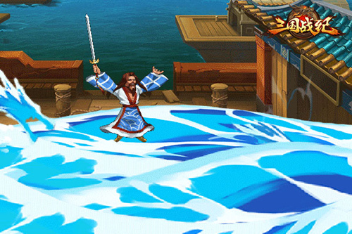 诸葛亮的必杀技“呼风唤雨”是街机迷们最熟悉的技能(没有之一),当年这个技能可谓是诸葛亮贪分、升级的绝技。技能施放时,可召唤出洪水攻击所有敌人。如今在《三国战纪OL》中,该技能同样是全体攻击,而且还附减怒和眩晕的效果,依旧非常强力。