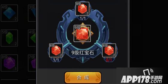 宝石共分为12个等级,最高等级为12级,3个同类型同等级的宝石可以合成1个更高级别的宝石,显而易见,要想获得1个九级红宝石,可以用3个八级红宝石合成(如图)。