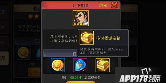 在委派任务中,由孙尚香、黄忠、夏侯惇、张飞、诸葛亮、貂蝉、马超、关羽、吕布和司马懿才可以单独完成的限定任务也可以获得相应等级的宝箱,有一定概率随机获得5级宝石。