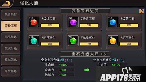 不同种类的宝石分别加成了不同种类的属性:红宝石加攻击力、蓝宝石加防御力、绿宝石加生命值、青宝石加命中、黄宝石加暴击,金刚石加绝对伤害、月光石加抗爆、紫宝石加闪避、黑耀石加伤害免疫。随着宝石的升级,所加属性也逐渐变多。4级宝石以下升级消耗金币,4级以上消耗元宝。此外,游戏内还有宝石强化大师系统,即宝石升级一轮,便获得一级宝石升级大师,增加生命值,攻击力和防御力。