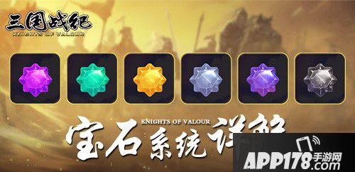 在大家熟悉的《三国战纪》街机中并没有宝石系统,是手游中的全新系统玩法。装备通过镶嵌各类宝石提高其对应属性,从而发挥作用。游戏中,宝石以颜色区分共有9类,依次是:红宝石、蓝宝石、紫宝石、绿宝石、黄宝石、青宝石、月光石、金刚石和黑耀石。每一件装备可以镶嵌两个不同种类的宝石,一共是6件装备12个宝石孔,因此红宝石、绿宝石和蓝宝石是可以镶嵌到两件装备上的,需求也略大一些。每颗宝石以等级区分,最低1级最高12级,宝石的升级仅能按部就班,逐级而升。