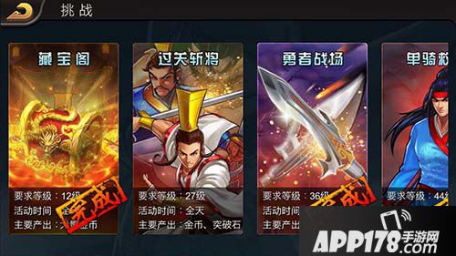 《三国战纪》手游的日常挑战中,“过关斩将”玩法因为其可以大量产出前期玩家奇缺的资源——金币、突破石、武将碎片,甚至是直接掉落武将,深受玩家喜爱。过关斩将位于主页“挑战”栏,进入里面的选择“过关斩将”则可直接进入战斗副本。副本按照玩家等级,划分为四种不同的难度,且通关不同难度获得的奖励也不同。