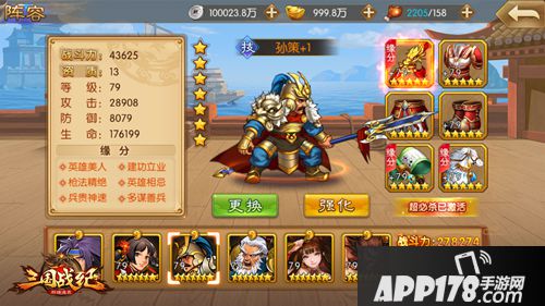 【解析】“神级”对13资质武将是越级配置,让孙策比一般13资质武将更强力;配“生命强化”而不是“攻击强化”,说明孙策更侧重防御能力,适合放在队伍的前排。