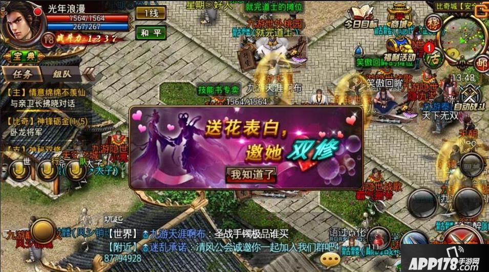 除了每天和妹子一起做做日常任务,下下副本,还要领妹子去打架。毕竟,咱们是一款热血PK游戏,带妹子去大杀四方也是一个爽。而且你能为妹子出生入死,妹子才会对你死心塌地。好了,终极奥义来了:在一个月黑风高的夜晚,你带领兄弟和妹子推倒了boss,在妹子说“你真棒”的时候,你从包裹里掏出从boss身上爆出来的两枚戒指,送给她并求婚,顺便说一句,结婚后,新婚锦囊里的东西都给你。到这一步,就应该可以放倒任何妹子了。