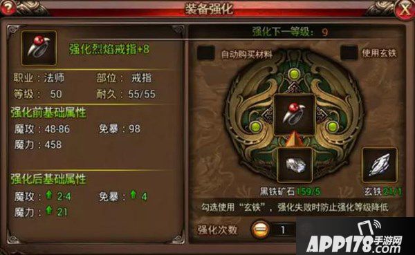 装备强化可增加装备的基础属性。强化等级从0到16级,等级越高,装备基础属性加成越强。装备强化需要消耗一定的强化材料,可能成功升级、保持不变,或较小概率降级。装备强化材料如黑铁矿石,可在各类活动中获得,做完一定量的目标任务也可以获得呢!
