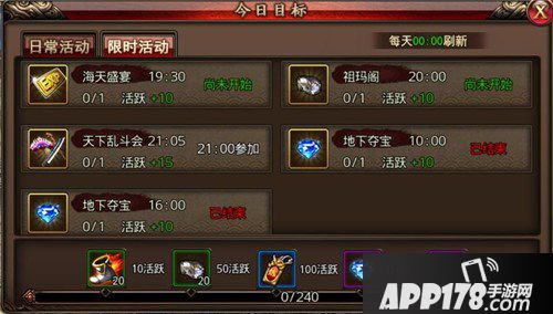 限时活动是在指定时间段开启的、全服都可以参与的大型活动。活动类型有需要PK争抢的地下夺宝,也有需要兄弟配合完成的祖玛阁。其奖励的丰富程度,足以促使你在活动时间段内上线参加。