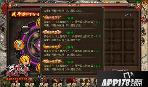 《沙巴克传奇》的魔魂系统不但能够提升玩家角色内在的属性,还能在外观显示方面有所变化。魔魂系统相当于一种战斗力的体现,玩家在装备到一定的魔魂境界后,角色的外显会产生变化,彰显至尊的荣耀和能力。