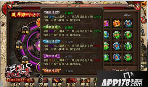 装备魔魂达到一定条件后,即可获得魔魂境界,境界获得后,玩家可以获得额外的魔魂属性加成,同时玩家在魔尊境界之后可以额外获得外观上的效果展示,境界越高,效果越强。