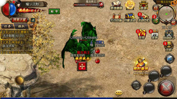 选择传送点进入林间圣地之后,玩家可以往右边的地图区域移动,在那里就可以看到通往魔龙领的传送点,同样的进入魔龙领之后继续往地图右侧移动就可以进入魔龙血域看到90级超级BOSS魔龙教主了,当然玩家要是觉得这样过于麻烦同样可以通过主界面的活动按钮进入选择BOSS界面同样可直接传送到魔龙血域地图省力省心。