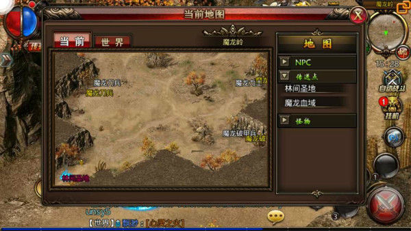 首先是新地图探秘,在此次《沙巴克传奇》更新的版本中新开放了3张高等级野外地图分别是林间圣地,魔龙岭,魔龙血域,三张地图之间其实是相邻的,玩家想要前往非常简单,只要先传送到盟重省,在地图的右下脚就会有两个传送点一个是岩壁沙漠一个就是新地图林间圣地。