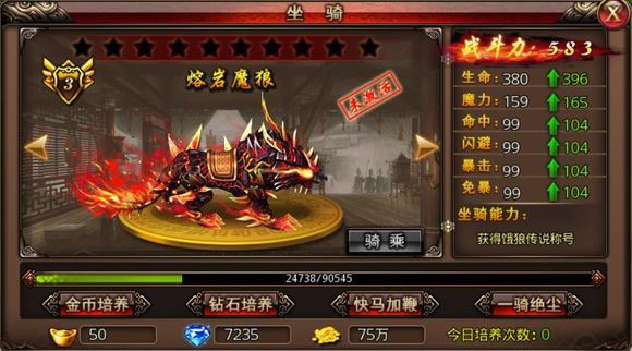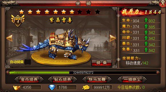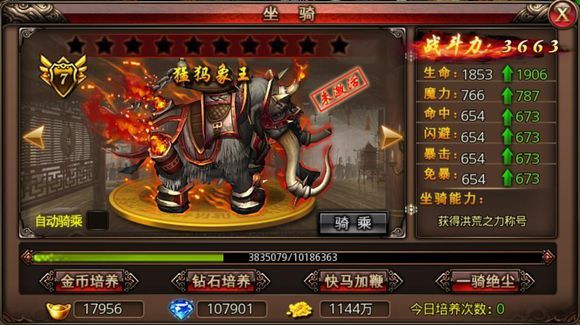 拥有坐骑之后自然就要对其进行强化培养,想要让坐骑快速提升品阶星级主要可以通过金币、钻石和元宝消耗三种途径进行培养: