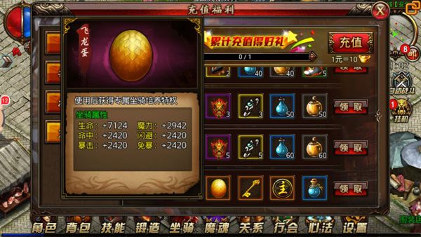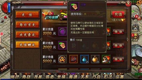 如果你觉得以上提及的坐骑都不是很满意的话,那或许你可以考虑一下玛法大陆上传说中的坐骑飞龙,此坐骑只能通过充值获得,是身份和地位的象征,而获得坐骑的玩家就可以直接骑乘使用了,很多玩家会疑问,为什么在主城中自己不能骑乘坐骑有的却能,这是因为对方拥有可以在主城骑乘的证明“马牌”,此道具可以在玩家充值达到一定数值之后免费领取,它还将会额外根据百分比增加坐骑属性值喔。