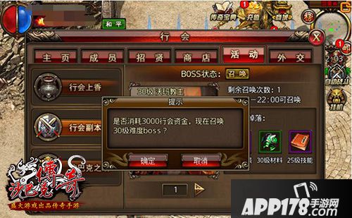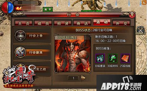 行会的会长和副会长可以在每天16:00-22:00召唤行会boss,本行会兄弟可以在得到提示后进入副本一起击杀boss。行会的等级越高,可召唤出的boss越强悍,掉落的宝物也就越多。在活动时间内,高等级行会可以召唤出更多boss。