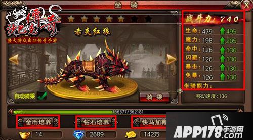 初阶的坐骑是踏雪飞马,每日可以使用金币、钻石或者元宝对坐骑进行培养升级,升级之后的坐骑属性会进一步提升。