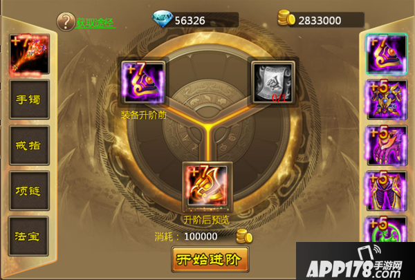 装备到达紫色+7或橙色+9可以进行装备进阶升级,进阶后颜色外貌发生变化,并且增加装备属性。其中,进阶消耗需要消耗进阶卷轴。