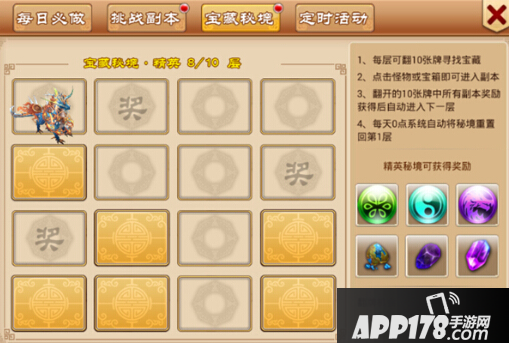 宝箱副本奖励:异宝、经验丹、铜币、强化石、紫宝石、机缘宝盒。