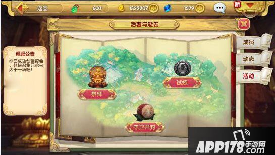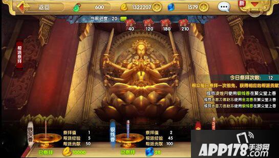(1) 祭拜:可通过消耗一定金币或钻石用来祭拜祖先,并获得帮派经验和帮派贡献奖励。根据祭拜贡品的不同可获得不同数量的进度值,当累积到一定条件时即可打开对应的宝箱获得游戏道具奖励。
