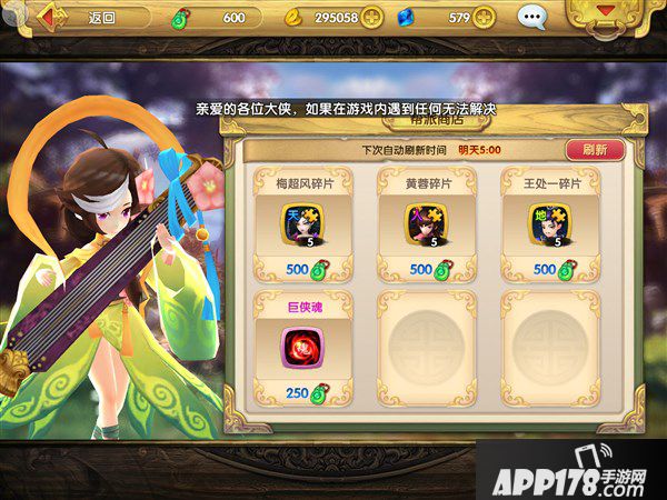 在进入游戏后系统会赠送我们一名人属性的英雄-萧别离,这个英雄足以应付前期的各种情况,因此在游戏初期我们不必花费太多心思在人属性英雄上。直到后期我们在帮派商店中兑换出黄蓉后,再大力培养黄蓉即可(每日帮派祭拜,金、银、铁全部祭拜的话只需6天便可兑换黄蓉)。
