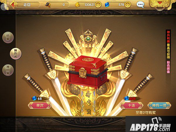 在进入游戏后,玩家最好充值一张月卡。花费28元不但可以立刻获得280钻石,每日还可以领取150钻石。同时玩家还可以激活至尊2特权,这时我们就可以使用游戏初期系统赠送的天工锤(神兵)在神兵阁中获取装备精炼材料,使你的装备可以快速升级、战力飙升!