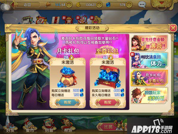 对于小R玩家而言,选择同时充值月卡礼包+至尊礼包是一个不多的选择。两种礼包可以相互叠加使用,这样玩家不但可以直接获取960钻石,每日还可领取300钻石。加之每日活动赠送的钻石,足以满足玩家每日购买体力与帮派祭拜等获得的需求。
