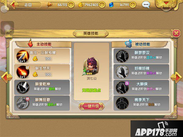 醉梦罗汉:醉里乾坤会造成12秒酒醉。醉里乾坤或醉生梦死后,洪七公也会酒醉,持续9秒。(蓝色+2解锁)