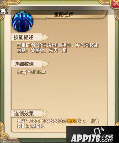 第二个主动技能叫碎星辰:王重阳以剑召雷,对面前的敌人造成伤害