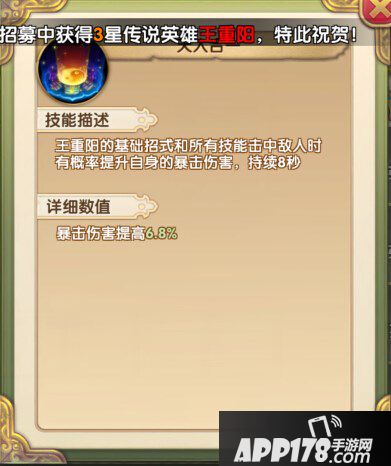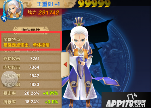 总的来说王重阳的输出很高,至于为什么,看看下面详细属性中的英雄特点吧:最强定点输出,单体控制。如果有条件获得,有什么理由让他坐冷板凳呢?