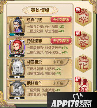 王重阳的英雄情缘分别是和丘处机的总真门徒,丘处机每升一星提高总生命百分之2;和段智兴的托付遗志,段智兴每升一星提高总外功攻击百分之2;和林朝英的相爱相杀、黄裳的武林泰斗,这两个英雄未开启,所以用不到