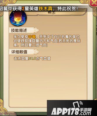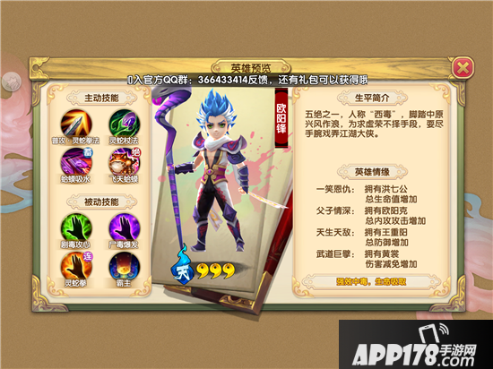 英雄的评价为强效中毒,生命吸取,在战斗中欧阳锋还算是比较持久,伤害也不错。但是这个英雄比较难获得,只有靠脸十连神招募或者比武商店才有可能得到了。