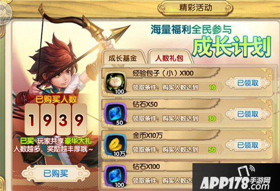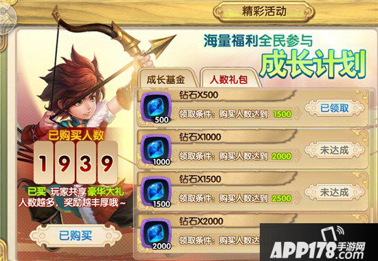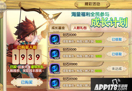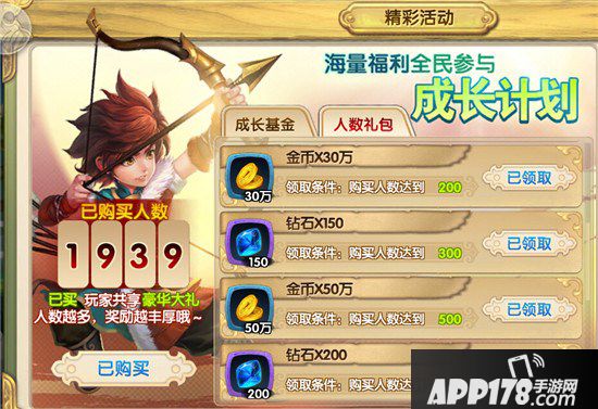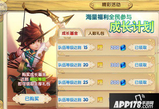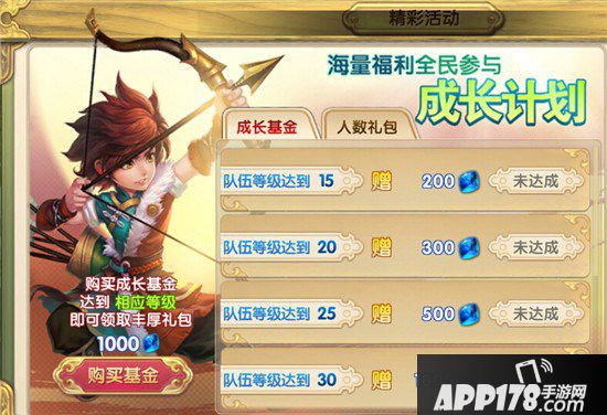 玩家需要用一千钻来购买这个基金,这个活动的回馈分为两种,一个叫成长基金,就是玩家每达到限定的等级后,就会回馈一定的钻石,这个活动只返钻,另外一个就叫做人数礼包,购买这个活动的人越多奖励就越高,购买人数会在左边显示,当购买人数达到特定的数量后,就会返一些东西,其中大部分都是钻石,剩下的是少量的金币和100个经验包子。