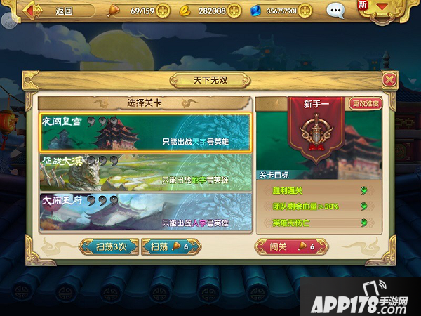 天下无双分为三个不同的关卡,每个关卡都需要玩家派遣不同的英雄去闯关。同时,每个关卡开放的时间也都不同,而玩家则需要在开放时间内派遣相应属性的英雄进入副本去闯关。每天玩家可以挑战3次关卡,每次都需要消耗6点体力。