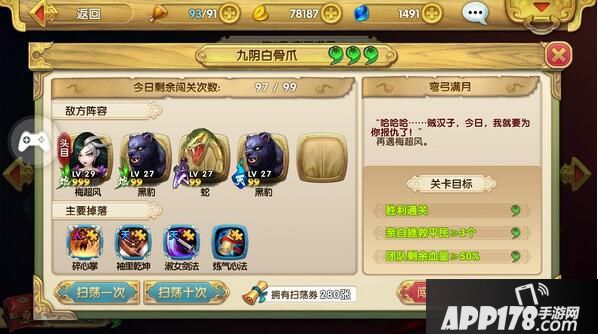 本关的BOSS梅超风属于地属性,可带上岳飞,前期建议着重培养。剩下的小怪,几个英雄轮流上即可。