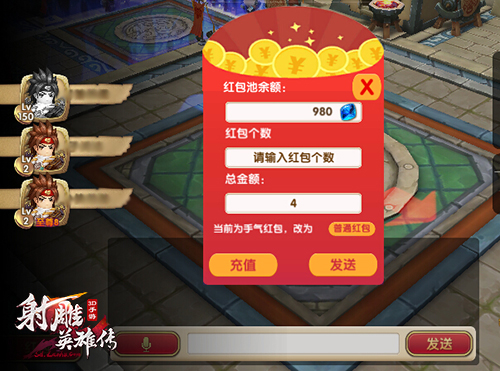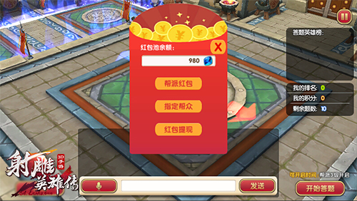 在红包系统上线后,各位《射雕英雄传3D》的玩家只需加入一个帮派,即可参与到红包活动当中。当帮派内有其他成员发放红包后,在帮派图标上会有小红包标示作为提醒,此时玩家进入帮派领地内,即可获取相应红包。